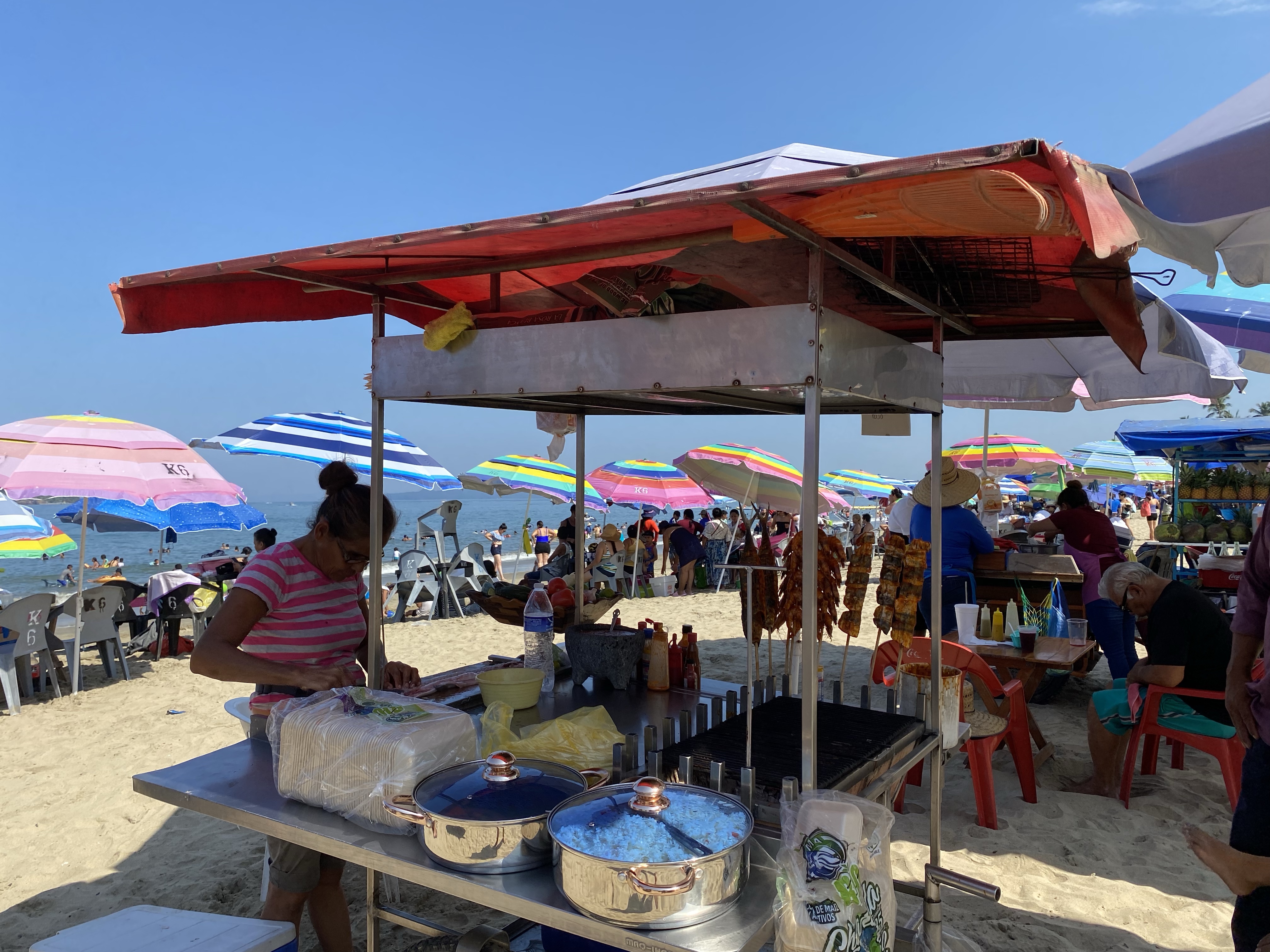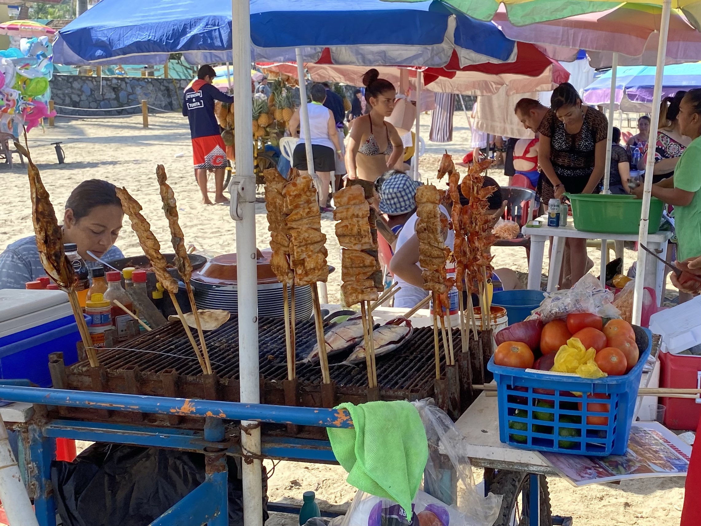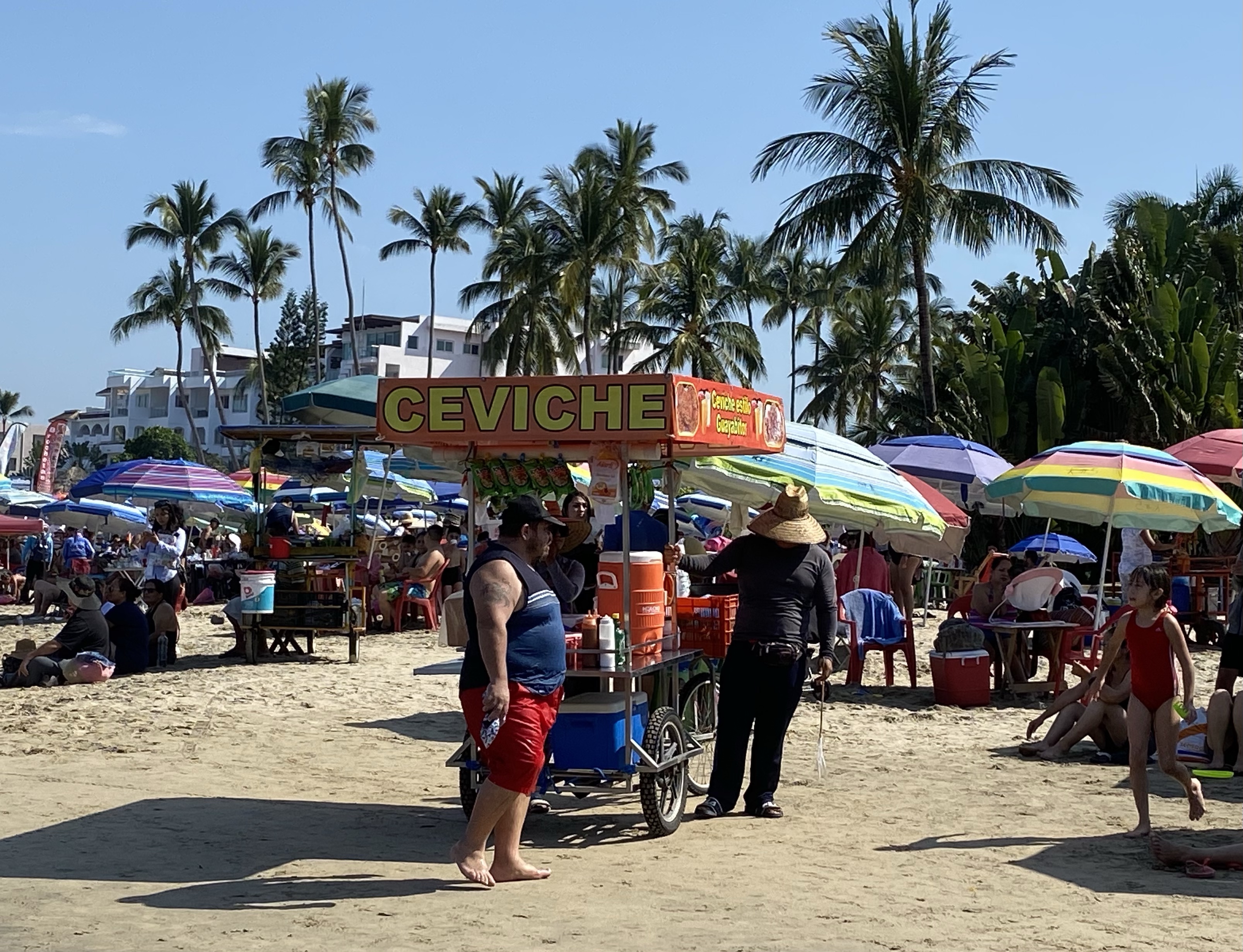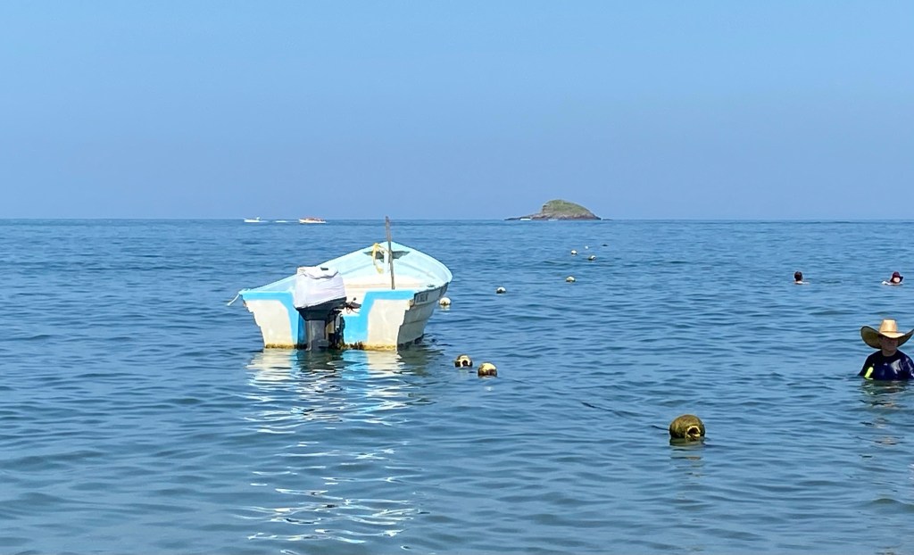 Siguen y dice el mexicano: “nuestra próxima estación es la playa de Guayabitos”. “¿Podré nadar?”, dice la alemana. “¿Podré comer y tomar un café?”, dice la española. “Un momentito, que me compro un bañador”, dice la japonesa. Van los cuatro a la playa de Guayabitos. El mexicano y la española alquilan una sombrilla y cuatro sillas (el mexicano negocia, la española paga). La alemana se quita la ropa y se va a nadar. La japonesa pasea, observa a los pelícanos y graba stories. La española se queda a cuadros con la oferta culinaria: camarones, pescado a la brasa, gorditas, ceviche, tostadas, tacos, tortillas, pico de gallo, agua de guanábana, zumo de piña… ¡hasta ostiones! (molusco con apariencia de ostra). Se levanta de la silla y va a la caza de la foto del blog (¡las boyas son calaveras doradas!) y del ceviche. Vuelve la española con siete tostadas de ceviche para los cuatro y está ya el mexicano luciendo tatuajes: “éste del brazo es de la mujer de mi vida, con la que ya no estoy, y éste del revés significa “la vida sigue”. Me acuerdo de Justi, que me decía antes de irme: “Ten cuidado con los mexicanos, que son muy dramáticos”. Toman ceviche el mexicano, la japonesa y la española, mientras la alemana busca algo vegano. Mal país México para los veganos… Terminan los cuatro sentados en la mesa tomando un pico de gallo espectacular que no lleva picante pero pica tela. Llega una mexicana ofreciendo un bizcochito de queso y también lo termina comprando la española… para el café.