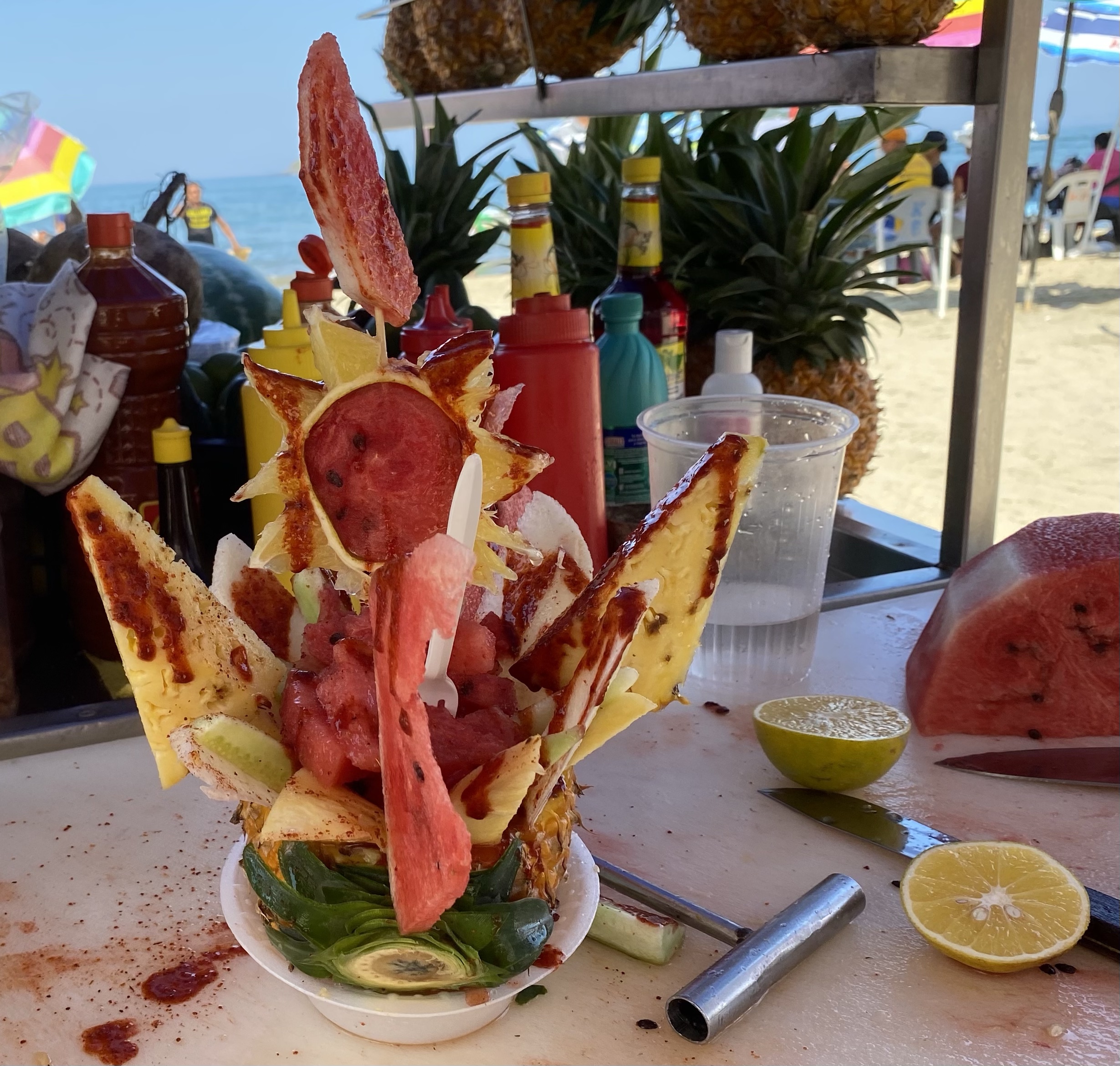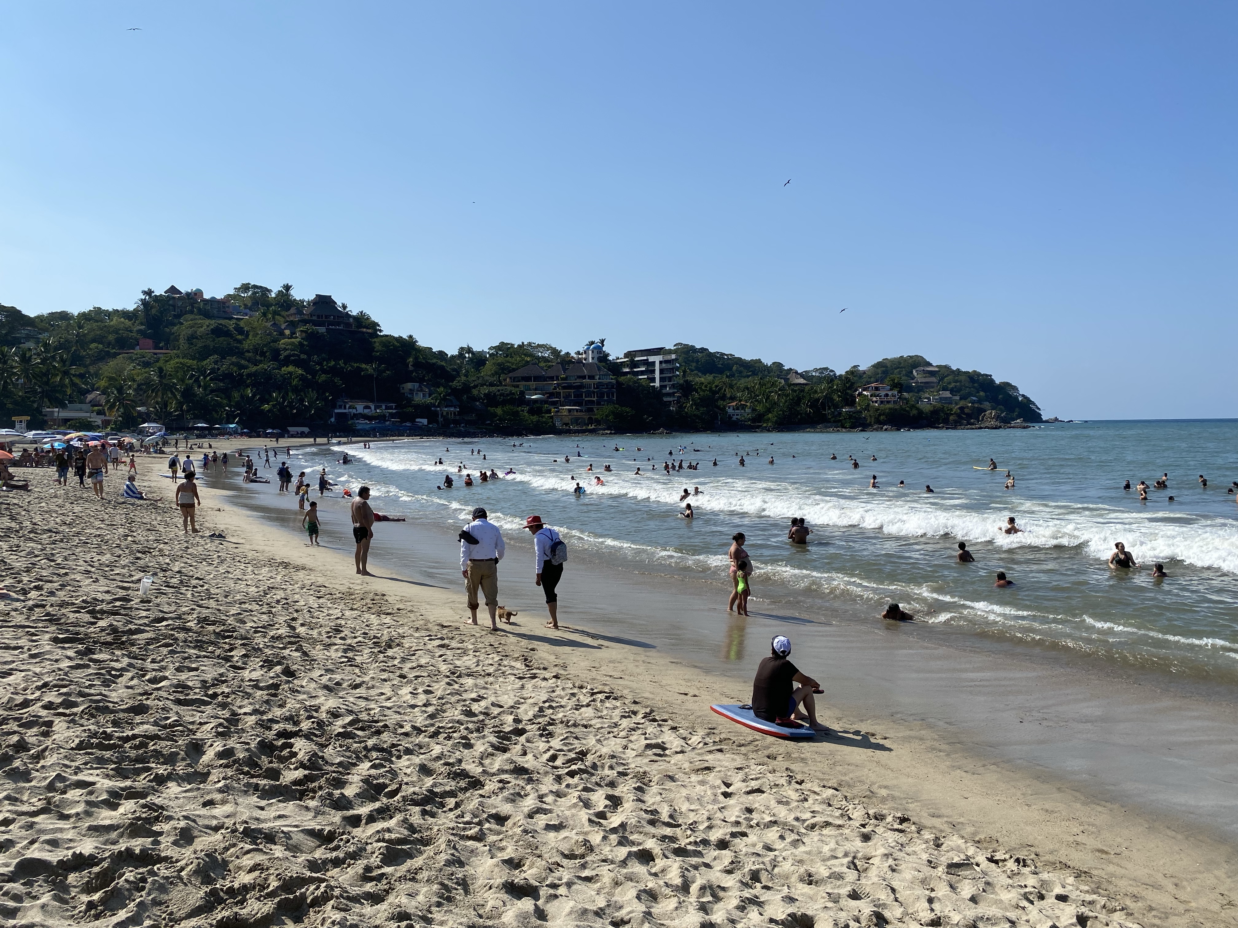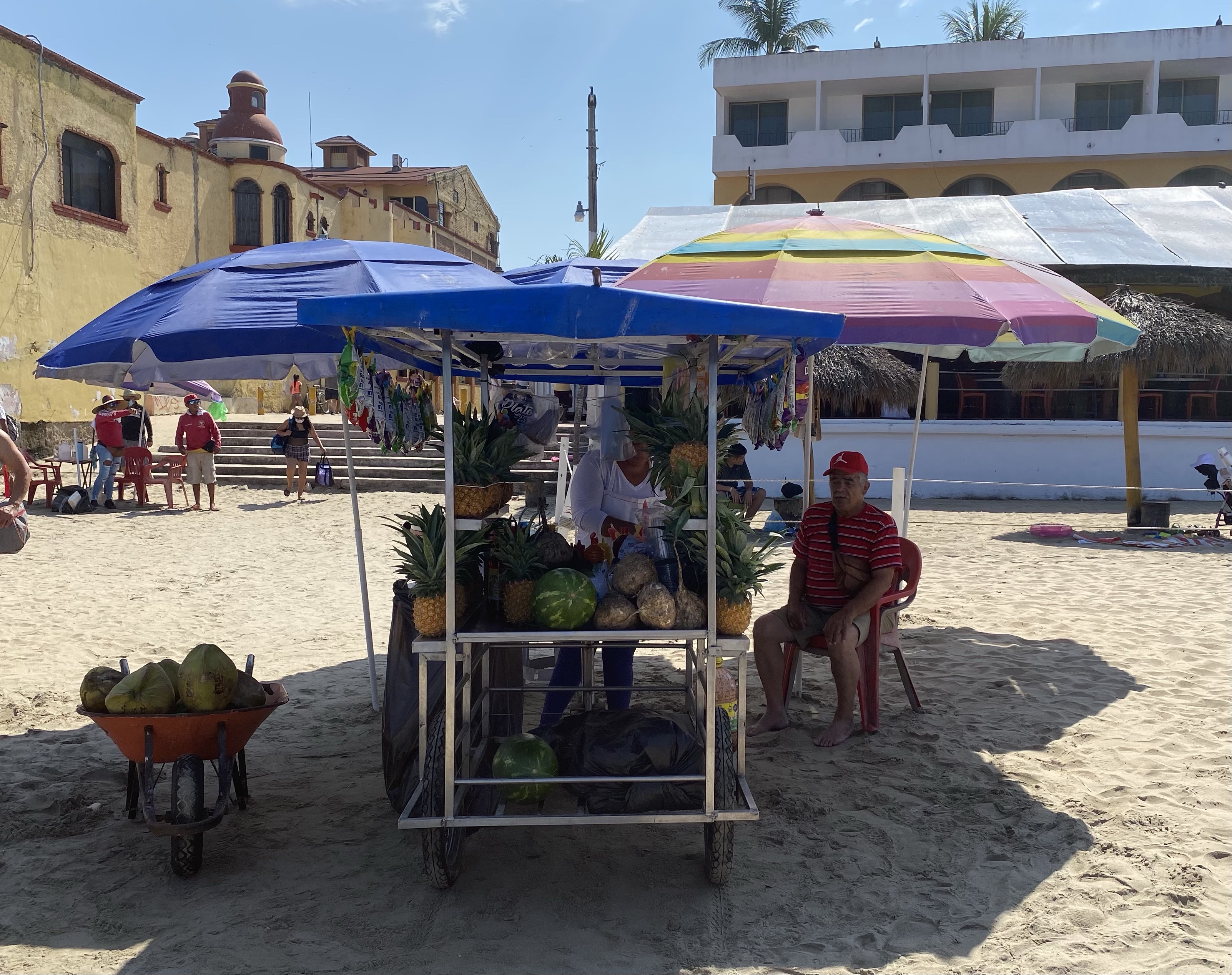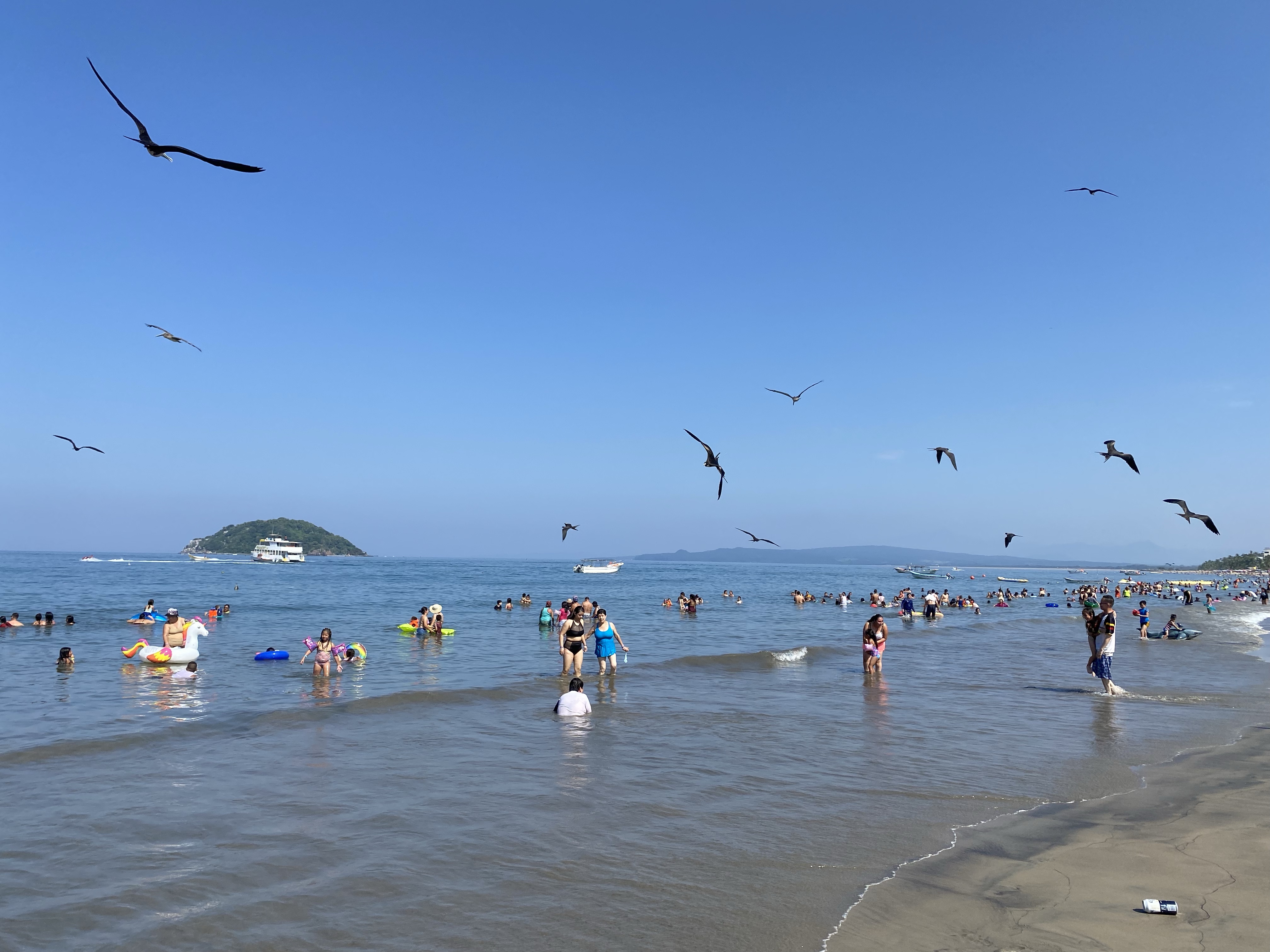 Siguen y dice el mexicano: “nuestra próxima estación es la playa de Guayabitos”. “¿Podré nadar?”, dice la alemana. “¿Podré comer y tomar un café?”, dice la española. “Un momentito, que me compro un bañador”, dice la japonesa. Van los cuatro a la playa de Guayabitos. El mexicano y la española alquilan una sombrilla y cuatro sillas (el mexicano negocia, la española paga). La alemana se quita la ropa y se va a nadar. La japonesa pasea, observa a los pelícanos y graba stories. La española se queda a cuadros con la oferta culinaria: camarones, pescado a la brasa, gorditas, ceviche, tostadas, tacos, tortillas, pico de gallo, agua de guanábana, zumo de piña… ¡hasta ostiones! (molusco con apariencia de ostra). Se levanta de la silla y va a la caza de la foto del blog (¡las boyas son calaveras doradas!) y del ceviche. Vuelve la española con siete tostadas de ceviche para los cuatro y está ya el mexicano luciendo tatuajes: “éste del brazo es de la mujer de mi vida, con la que ya no estoy, y éste del revés significa “la vida sigue”. Me acuerdo de Justi, que me decía antes de irme: “Ten cuidado con los mexicanos, que son muy dramáticos”. Toman ceviche el mexicano, la japonesa y la española, mientras la alemana busca algo vegano. Mal país México para los veganos… Terminan los cuatro sentados en la mesa tomando un pico de gallo espectacular que no lleva picante pero pica tela. Llega una mexicana ofreciendo un bizcochito de queso y también lo termina comprando la española… para el café.