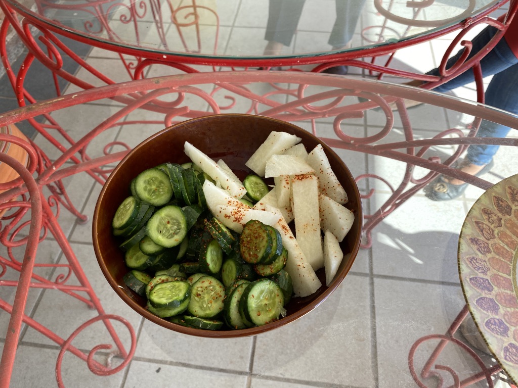 Comenzó nuestro lunch break con una botanita o picoteo de pepino y rábano con chile, a la que siguieron carnitas (carne confitada y troceada, muy popular en México), fríjoles con chorizo, ensalada de nopales (cáctus de textura gelatinosa), arroz y, de postre, obleas de cajeta (dulce de leche). De beber, agua de guanábana (fruta deliciosa de textura parecida a la chirimoya y con un sabor hasta ahora desconocido para mi paladar europeo).