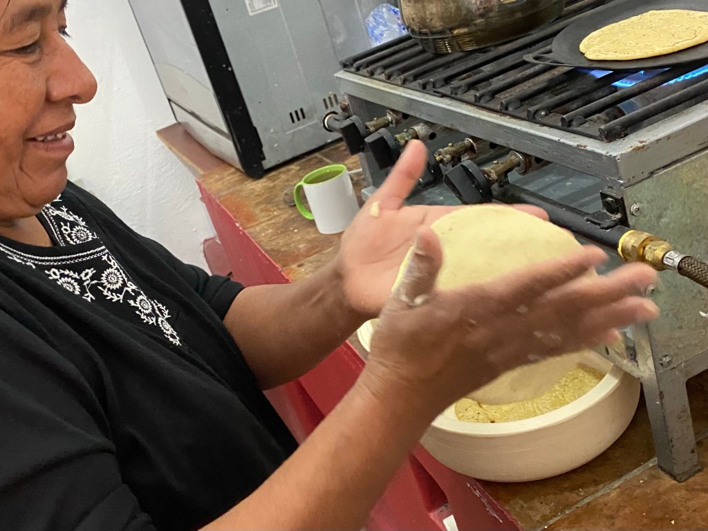 Heute war mein persönlicher Höhepunkt des gesamten mexikanischen Abenteuers: Tortear mit Gloria! Tortear bedeutet, mexikanische Mais- oder Weizentortillas zu modellieren und anzubraten, um sie dann „pur“, mit Salz und Zitrone, mit Bohnen, mit Früchten, Cajeta (Karamelsoße), Guacamole oder Fleisch zu geniessen. Die nationale Sportart, könnte man sagen. Hauptsächlich weiblicher Natur…